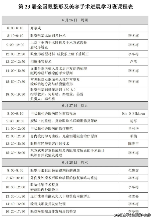 第 23 屆全國(guó)眼整形及美容手術(shù)進(jìn)展學(xué)習(xí)班課程表