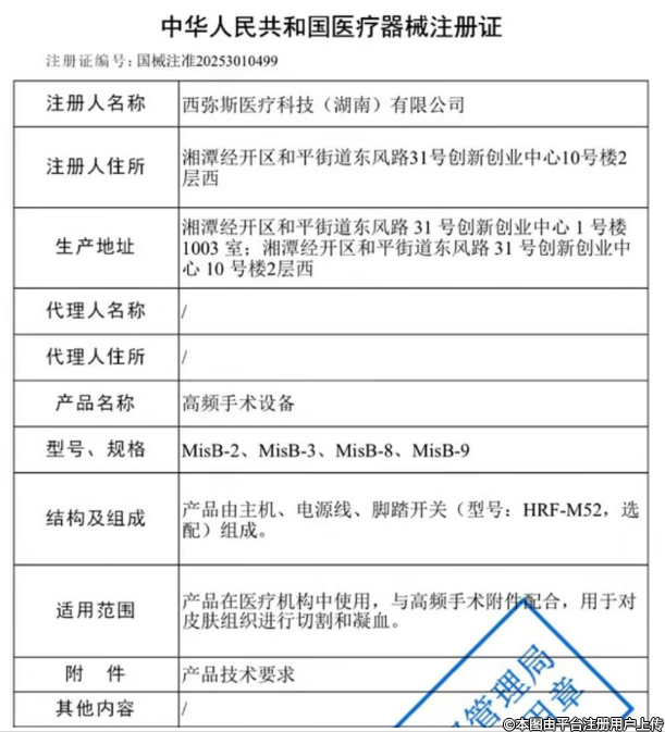 根據(jù)國家藥監(jiān)局《2025年03月06日醫(yī)療器械批準證明文件送達信息》顯示,西彌斯旗下“高頻手術(shù)設(shè)備”獲得批準。注冊編號:國械注準20253010499;適用范圍為:產(chǎn)品在醫(yī)療機構(gòu)中使用,與高頻手術(shù)附件配合,用于對皮膚組織進行切割和凝血。