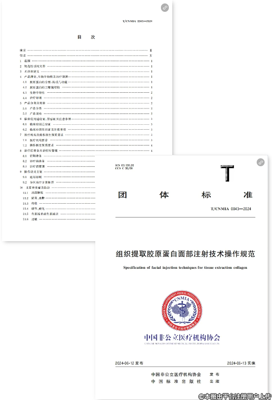 膠原蛋白注射市場快速增長,其應(yīng)用范圍日益拓展,需要臨床操作加快標(biāo)準(zhǔn)化進(jìn)程?;诖吮尘?,2024年7月,《組織提取膠原蛋白面部注射技術(shù)操作規(guī)范》團(tuán)體標(biāo)準(zhǔn)(T/CNMIA 0043-2024)正式發(fā)布(以下簡稱“團(tuán)體標(biāo)準(zhǔn)”),成為行業(yè)內(nèi)首個針對提取膠原蛋白面部注射技術(shù)的權(quán)威指南,標(biāo)志著注射膠原蛋白行業(yè)進(jìn)入標(biāo)準(zhǔn)化發(fā)展階段。