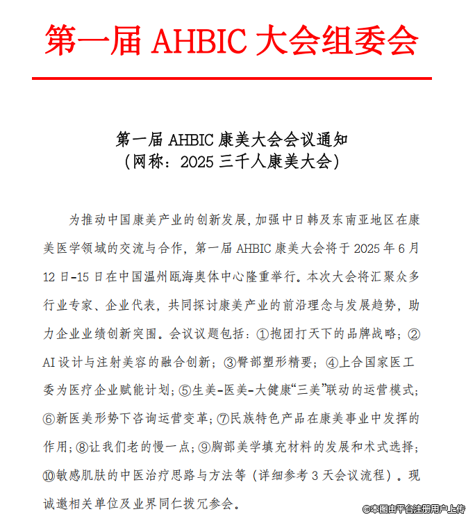 為推動中國康美產(chǎn)業(yè)的創(chuàng)新發(fā)展,加強中日韓及東南亞地區(qū)在康美醫(yī)學(xué)領(lǐng)域的交流與合作,第一屆 AHBIC 康美大會將于2025 年6月12 日-15 日在中國溫州甌海奧體中心隆重舉行。本次大會將匯聚眾多行業(yè)專家、企業(yè)代表,共同探討康美產(chǎn)業(yè)的前沿理念與發(fā)展趨勢,助力企業(yè)業(yè)績創(chuàng)新突圍。會議議題包括:①抱團打天下的品牌戰(zhàn)略;②AI設(shè)計與注射美容的融合創(chuàng)新;③臀部塑形精要:4上合國家醫(yī)工委為醫(yī)療企業(yè)賦能計劃:⑤生美-醫(yī)美-大健康“三美”聯(lián)動的運營模式:⑥新醫(yī)美形勢下咨詢運營變革;⑦民族特色產(chǎn)品在康美事業(yè)中發(fā)揮的作用;⑧讓我們老的慢一點;⑨胸部美學(xué)填充材料的發(fā)展和術(shù)式選擇⑩敏感肌膚的中醫(yī)治療思路與方法等(詳細參考3天會議流程)?,F(xiàn)誠邀相關(guān)單位及業(yè)界同仁撥冗參會。