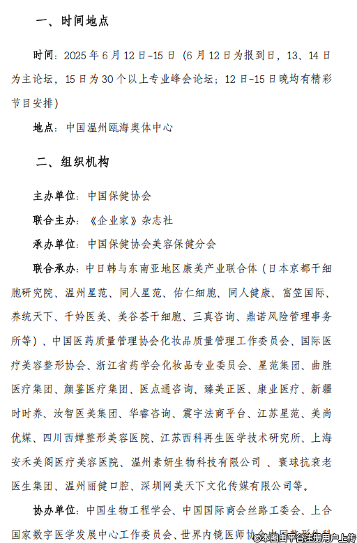 協(xié)辦單位:中國生物工程學(xué)會、中國國際商會絲路工委會、上合國家數(shù)字醫(yī)學(xué)發(fā)展中心工作委員會、世界內(nèi)鏡醫(yī)師協(xié)會中國整形外科聯(lián)盟委員會、國際醫(yī)療美容整形協(xié)會、中國整形美容協(xié)會頭面頸輪美學(xué)與美容分會、溫州市醫(yī)學(xué)會醫(yī)學(xué)美學(xué)與美容學(xué)分會、溫州市中醫(yī)藥學(xué)會中醫(yī)美容分會、溫州市整形美容行業(yè)協(xié)會、溫州市醫(yī)療器械行業(yè)協(xié)會、溫州醫(yī)科大學(xué)同一健康研究院、溫州市千細胞/生物樣本庫合作平臺、溫州市區(qū)域細胞制備中心服務(wù)平臺、加拿大SK醫(yī)學(xué)交流發(fā)展集團等,