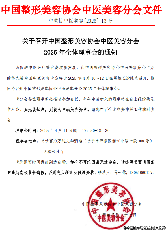 關于召開2025年中國整形美容協(xié)會中醫(yī)美容分會全體理事會的通知