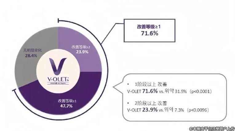 此外,V-OLET溶脂針具備完整臨床實驗數(shù)據(jù)和上市后監(jiān)測數(shù)據(jù)以及具備顯著的統(tǒng)計學(xué)意義的臨床安全性和臨床有效性數(shù)據(jù)。V-OLET溶脂針共計完成4項臨床試驗(I期/II期/III期/PMS),總臨床試驗人數(shù)超過960人,其中71.6%的受試者頦下脂肪(SMF)得到1個等級以上的明顯改善。