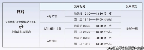 為方便參會(huì)人員會(huì)議出行,大會(huì)期間安排地鐵9號(hào)線松江大學(xué)3號(hào)出口至富悅酒店大會(huì)往返班車接駁。4月18日-19日7:30——18:30全天地鐵站至酒店班車接駁,更多大會(huì)班車發(fā)車信息見(jiàn)下方發(fā)車表。