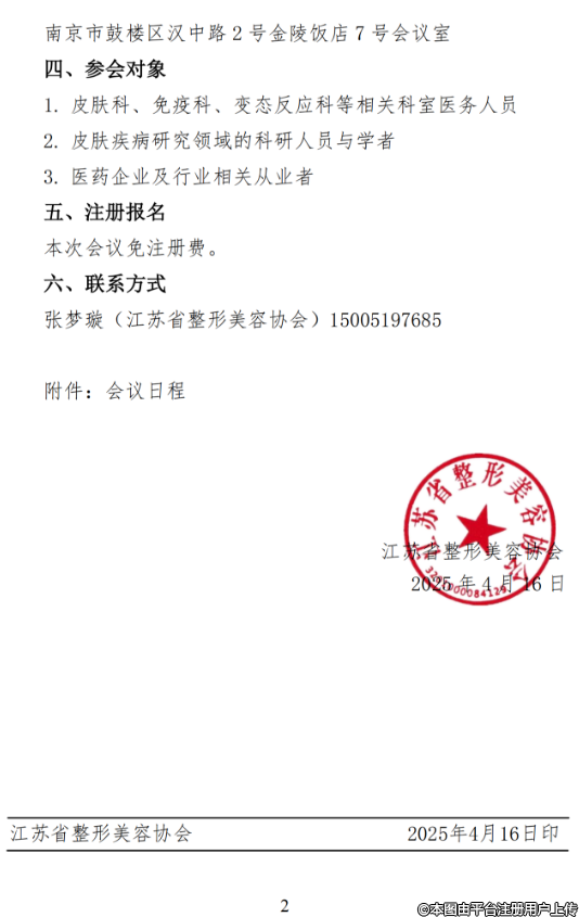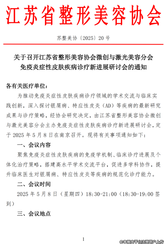 關(guān)于召開江蘇省整形美容協(xié)會微創(chuàng)與激光美容分會免疫炎癥性皮膚疾病診療新進展研討會的通知