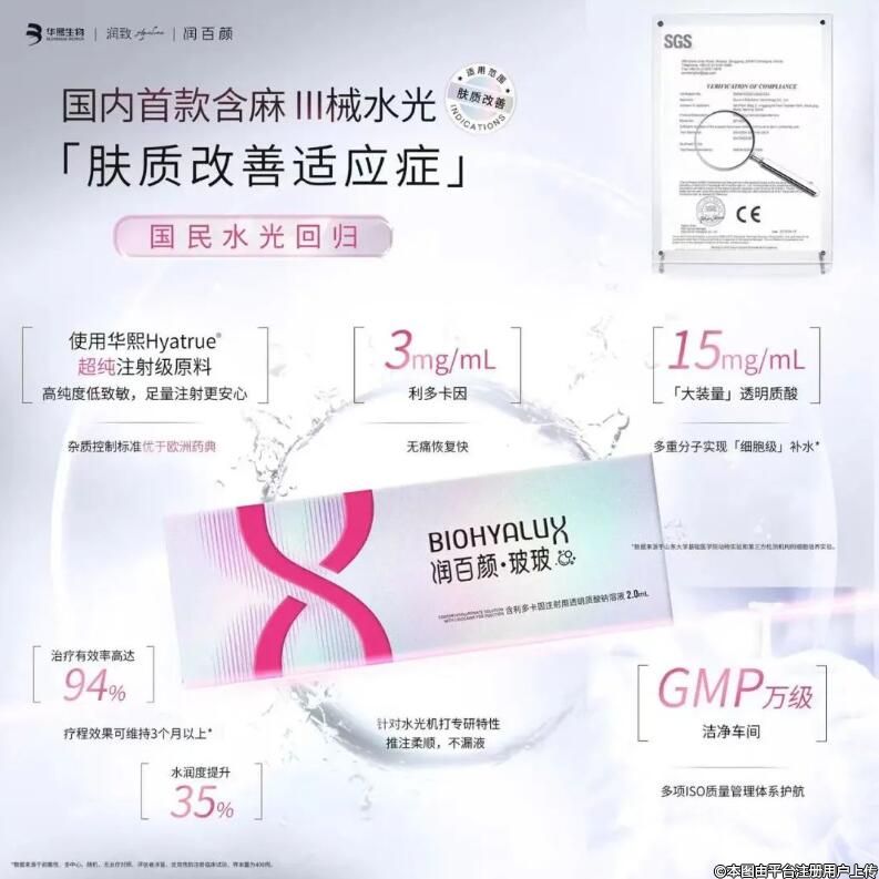 2025年4月25日,華熙生物自主研發(fā)的「含利多卡因注射用透明質(zhì)酸鈉溶液」即「潤百顏·玻?!拐将@批Ⅲ類醫(yī)療器械證,作為國內(nèi)首個明確“面部膚質(zhì)改善適應(yīng)癥”的合規(guī)水光產(chǎn)品,此次獲批不僅彰顯了華熙生物在醫(yī)美領(lǐng)域的技術(shù)領(lǐng)導(dǎo)力,也預(yù)示著水光產(chǎn)品市場從“野蠻生長”向“精耕細(xì)作”的全面轉(zhuǎn)型,更為中國水光產(chǎn)品市場的規(guī)范化發(fā)展樹立全新標(biāo)桿。