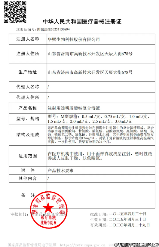 近日,繼"潤百顏·玻玻"Ⅲ類醫(yī)療器械注冊證獲批后僅一周,華熙生物再傳捷報,其自主研發(fā)的“注射用透明質(zhì)酸鈉復合溶液-M型”(商品名:潤致·緹透)正式斬獲由NMPA頒發(fā)的Ⅲ類醫(yī)療器械注冊證,注冊證號為國械注準20253130894。