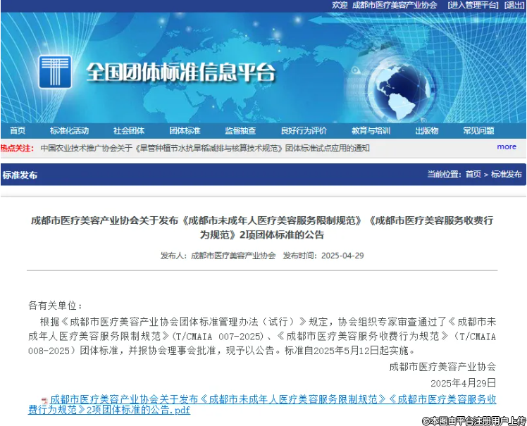 5月8日,成都市醫(yī)療美容產(chǎn)業(yè)協(xié)會正式發(fā)布《成都市醫(yī)療美容服務(wù)收費(fèi)行為規(guī)范》《成都市未成年人醫(yī)療美容服務(wù)限制規(guī)范》兩項(xiàng)團(tuán)體標(biāo)準(zhǔn),這是繼2024年“醫(yī)美之都?”成都標(biāo)準(zhǔn)體系建設(shè)后的又一里程碑,標(biāo)志著成都醫(yī)美產(chǎn)業(yè)向 “標(biāo)準(zhǔn)化、品質(zhì)化、國際化”邁進(jìn)新高度!