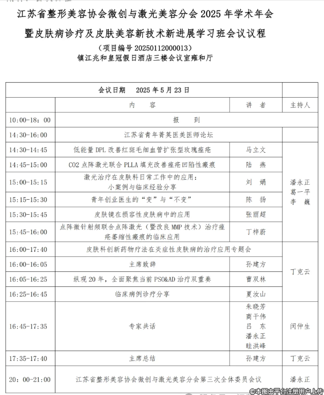 為發(fā)揮江蘇省整形美容協(xié)會微創(chuàng)與激光美容分會的引領(lǐng)作用,推動我省醫(yī)療美容皮膚與激光美容事業(yè)的發(fā)展,經(jīng)協(xié)會研究,由江蘇省整形美容協(xié)會主辦、鎮(zhèn)江市第一人民醫(yī)院承辦的江蘇省整形美容協(xié)會微創(chuàng)與激光美容分會2025年學(xué)術(shù)年會暨皮膚病診療及皮膚美容新技術(shù)新進(jìn)展學(xué)習(xí)班(項(xiàng)目編號:20250112000013)定于2025年5月23-25日在鎮(zhèn)江召開?,F(xiàn)將會議有關(guān)事宜通知如下: