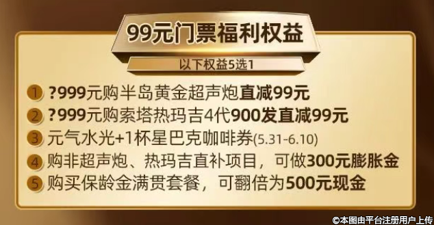 99元=占位半島黃金超聲炮超值福利價(jià),使用門票可直減99元。
