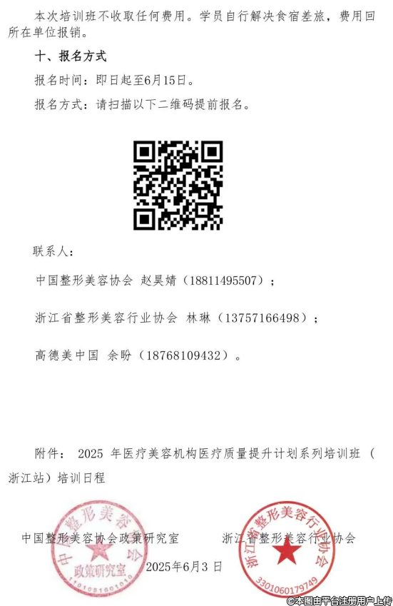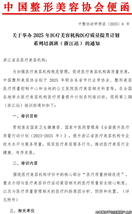 各醫(yī)療美容機構(gòu):為加強醫(yī)療美容機構(gòu)規(guī)范管理,促進醫(yī)療美容機構(gòu)高質(zhì)量發(fā)展,中國整形美容協(xié)會聯(lián)合浙江省整形美容行業(yè)協(xié)會擬于6月25日在杭州舉辦”醫(yī)療美容機構(gòu)醫(yī)療質(zhì)量提升計劃系列培訓班”?,F(xiàn)將第三期(浙江站)培訓班通知轉(zhuǎn)發(fā)如下,請大家踴躍報名。本次培訓班不收取任何費用。