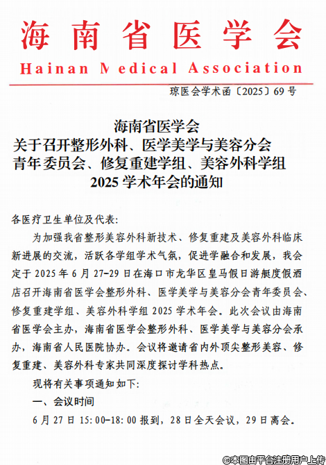 海南省醫(yī)學會 關于召開整形外科、 醫(yī)學美學與美容分會青年委員會、 修 復重建學組、美容外科學組 2025學 術年會的通知
