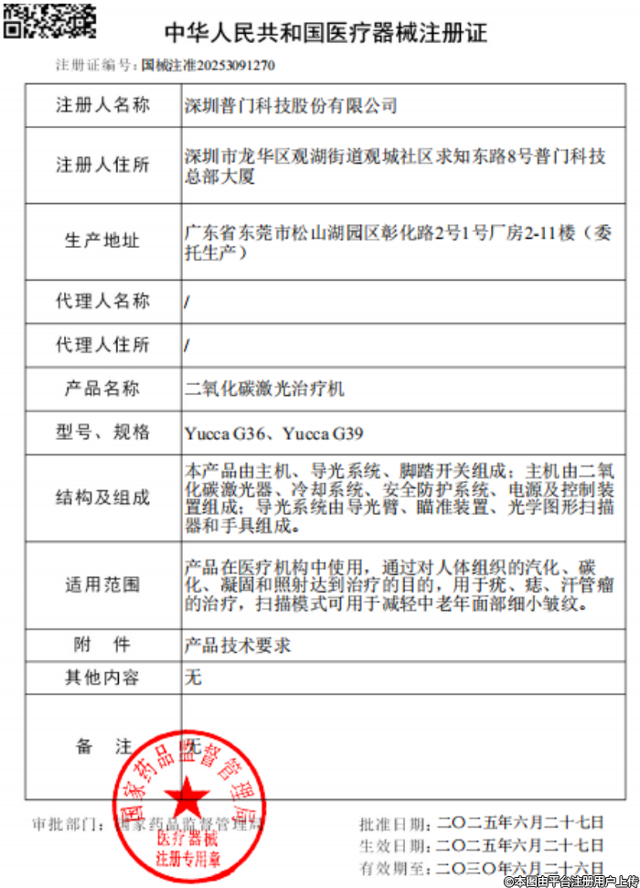 近日,普門科技旗下Ⅲ類醫(yī)療器械「二氧化碳激光治療機(jī)」正式獲得國家藥監(jiān)局批準(zhǔn)上市,國械注準(zhǔn)為20253091270,獲批適應(yīng)癥為“在醫(yī)療機(jī)構(gòu)中使用,通過對(duì)人體組織的汽化、碳化、凝固和照射達(dá)到治療的目的,用于疣、痣、汗管瘤的治療,掃描模式可用于減輕中老年面部細(xì)小皺紋。”