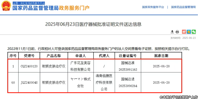 近日,國家藥品監(jiān)督管理局(NMPA)發(fā)布最新醫(yī)療器械批準(zhǔn)信息,兩款射頻皮膚治療儀正式獲批Ⅲ類醫(yī)療器械認(rèn)證,標(biāo)志著中國醫(yī)美器械領(lǐng)域再迎技術(shù)突破。此次獲批的產(chǎn)品分別來自廣東花至美容科技有限公司和ャ一マン株式會(huì)社(海南倍捷醫(yī)療科技有限公司代理),將進(jìn)一步豐富國內(nèi)合規(guī)醫(yī)美器械市場(chǎng)選擇,推動(dòng)行業(yè)規(guī)范化發(fā)展。