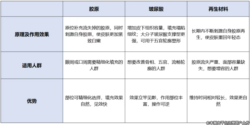 現(xiàn)在市面上注射填充的材料這么多,該怎么選?今兒咱們就幾種主流材料來邊對比邊聊聊。講講膠原vs玻尿酸vs再生材料,這三大類常見材料的特性、適應(yīng)類型、優(yōu)缺點(diǎn),幫助大家做選擇。