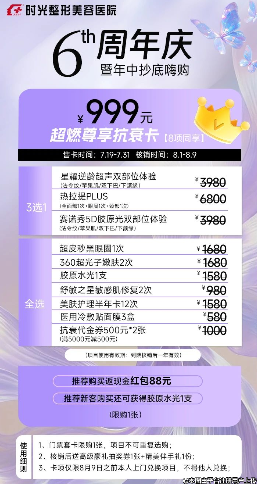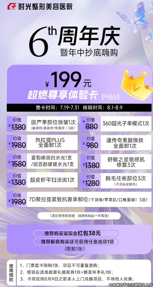 興義時光整形 · 6周年慶暨年中抄底嗨購會,推出超燃尊享體驗卡,9選5只要199元,超燃尊顏抗衰卡,8項同享999元,超燃尊容中胚卡,8項同享1999元,超燃尊貴塑形卡,5項同享3999元,超大優(yōu)惠全場一折起。