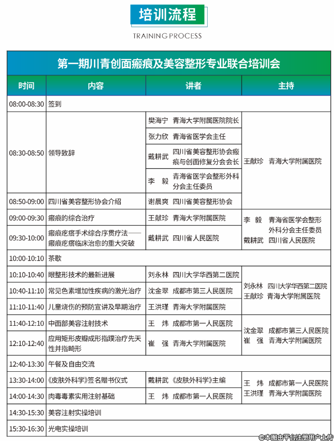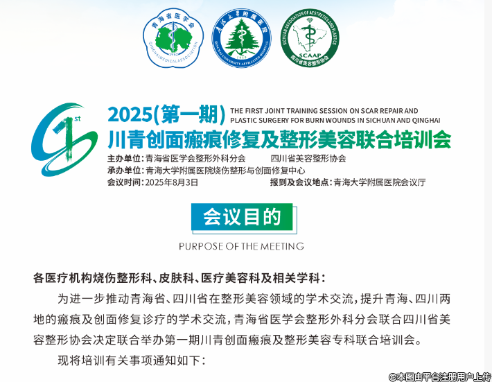 為進(jìn)一步推動青海省、四川省在整形美容領(lǐng)域的學(xué)術(shù)交流,提升青海、四川兩地的瘢痕及創(chuàng)面修復(fù)診療的學(xué)術(shù)交流,青海省醫(yī)學(xué)會整形外科分會聯(lián)合四川省美容整形協(xié)會決定聯(lián)合舉辦第一期川青創(chuàng)面瘢痕及整形美容??坡?lián)合培訓(xùn)會。