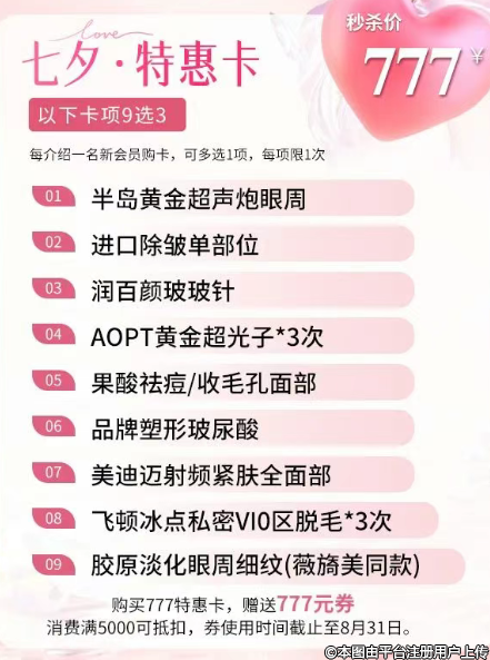 摯愛(ài)獻(xiàn)禮 寵愛(ài)限定禮遇,福州美貝爾整形七夕777特惠卡,9選3。老帶新加贈(zèng)1項(xiàng),多帶多贈(zèng)。777元消費(fèi)抵用超值券,數(shù)量有限,抓緊搶。
