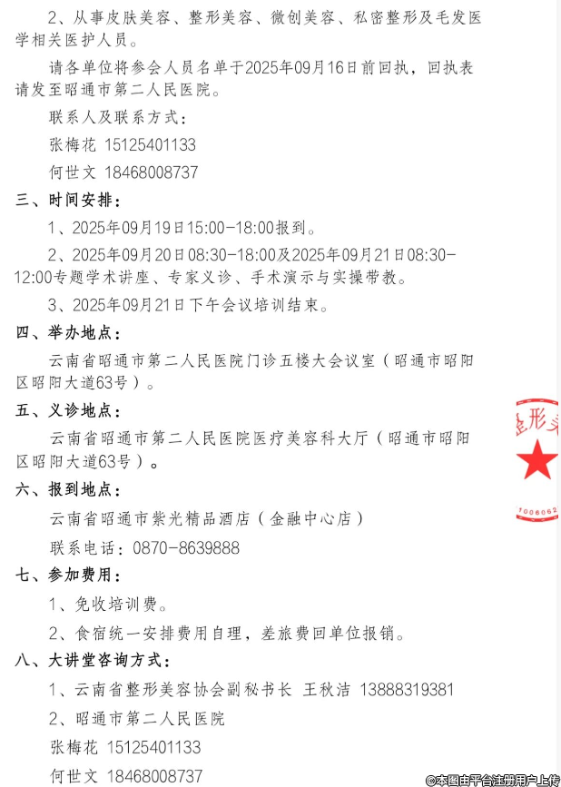 為提高廣大臨床醫(yī)護人員皮膚美容、整形外科、防脫生發(fā)診療與服務(wù)水平,促進相關(guān)醫(yī)療機構(gòu)的規(guī)范化發(fā)展,讓更多患者與求美者受益,由云南省整形美容協(xié)會主辦,昭通市第二人民承辦的“云南省整形美容協(xié)會基層大講堂昭通市昭陽區(qū)站”擬于2025年09月19日-21日在昭通市舉辦。