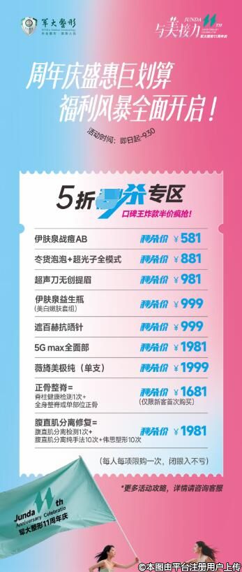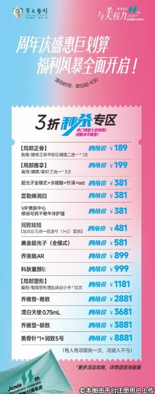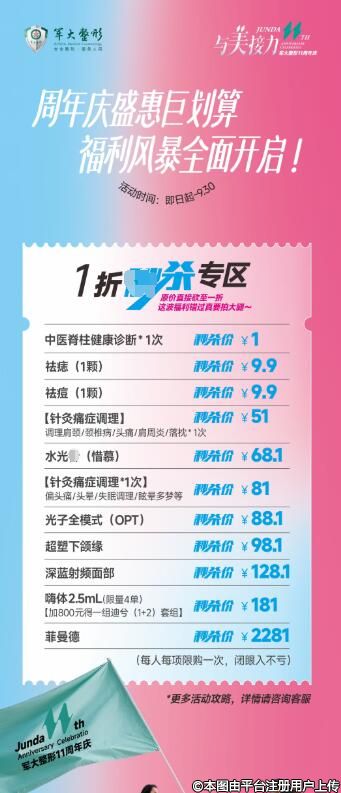 價格為什么如此美麗?答案就在軍大周年慶!周年慶一折專區(qū),精選項(xiàng)目低至冰點(diǎn)價,祛痘祛痣、光子全模式、超塑下頜緣...只需1元起,美麗蛻變不再是夢!限購一次,把握機(jī)會,讓美麗觸手可及。