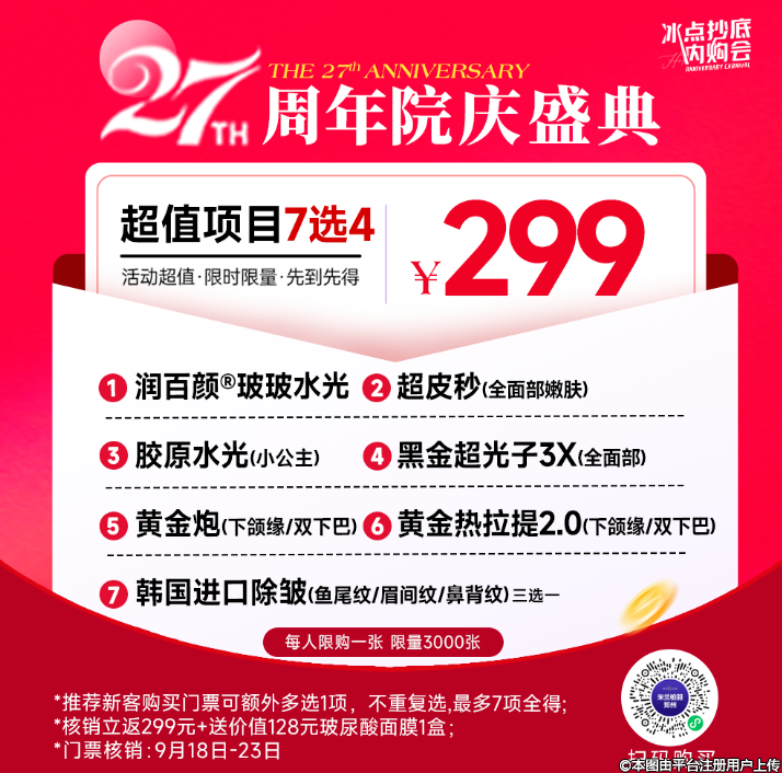 米蘭柏羽集美27周年慶重磅來襲,【冰點抄底內購會】,0元卡感恩巨獻,299元任選四項價值千元爆款項目,轉介可多選,核銷立返299元,等于爆款項目免費送。