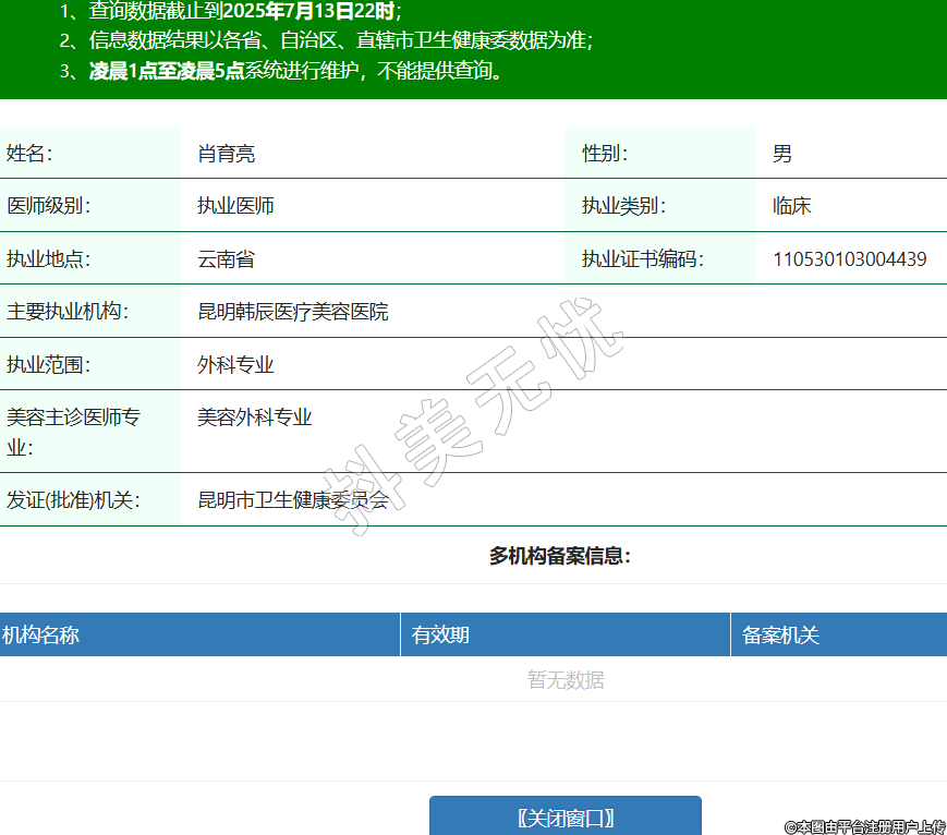 姓名:肖育亮性別:男醫(yī)師級別:執(zhí)業(yè)醫(yī)師執(zhí)業(yè)類別:臨床執(zhí)業(yè)地點(diǎn):云南省執(zhí)業(yè)證書編碼:110530103004439主要執(zhí)業(yè)機(jī)構(gòu):昆明韓辰醫(yī)療美容醫(yī)院執(zhí)業(yè)范圍:外科專業(yè)美容主診醫(yī)師專業(yè):美容外科專業(yè)發(fā)證(批準(zhǔn))機(jī)關(guān):昆明市衛(wèi)生健康委員會(huì)