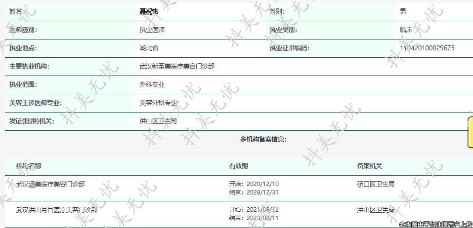 主要執(zhí)業(yè)機(jī)構(gòu):武漢新至美醫(yī)療美容門(mén)診部