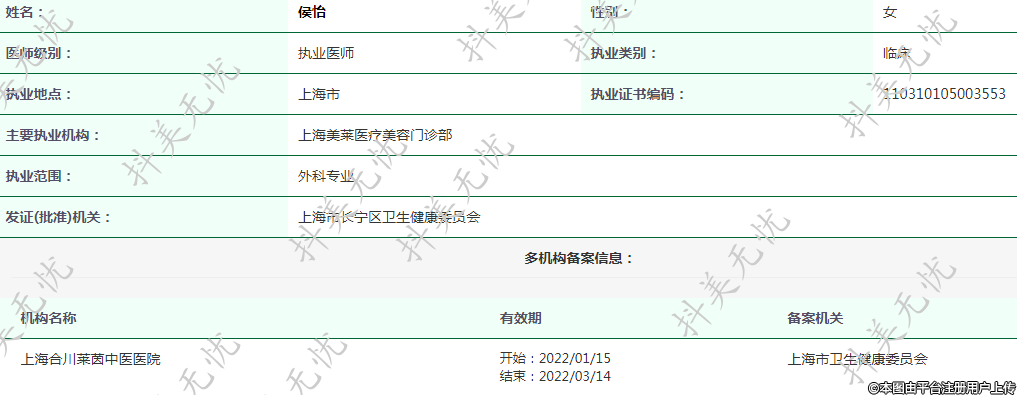 主要執(zhí)業(yè)機(jī)構(gòu):上海美萊醫(yī)療美容門(mén)診部