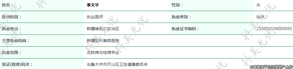 醫(yī)師執(zhí)業(yè)編碼:210650104000091,畢業(yè)于新疆醫(yī)科大學(xué),原蘭州軍區(qū)烏魯木齊總醫(yī)院皮膚激光主治醫(yī)師。