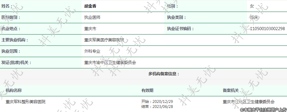 主要執(zhí)業(yè)機(jī)構(gòu):重慶軍美醫(yī)療美容醫(yī)院