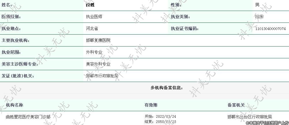 機構(gòu)名稱:曲勝星范醫(yī)療美容門診部