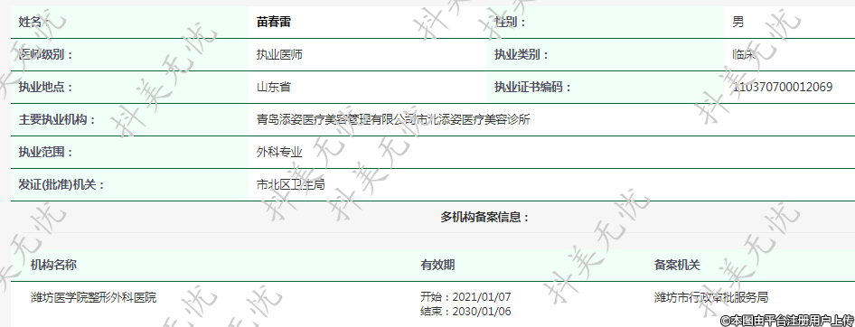 主要執(zhí)業(yè)機(jī)構(gòu):青島添姿醫(yī)療美容管理有限公司市北添姿醫(yī)療美容診所