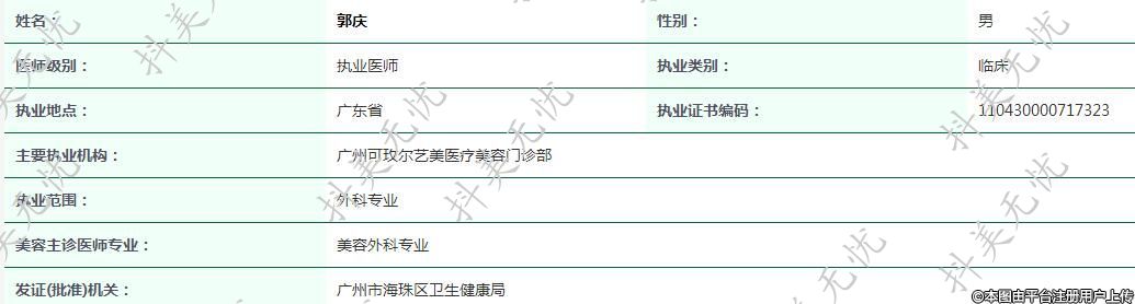 姓名:郭慶性別:男醫(yī)師級(jí)別:執(zhí)業(yè)醫(yī)師執(zhí)業(yè)類別:臨床執(zhí)業(yè)地點(diǎn):廣東省執(zhí)業(yè)證書(shū)編碼:110430000717323主要執(zhí)業(yè)機(jī)構(gòu):廣州可玫爾藝美醫(yī)療美容門診部執(zhí)業(yè)范圍:口外科專業(yè)美容主診醫(yī)師專業(yè):美容皮膚科專業(yè)發(fā)證(批準(zhǔn))機(jī)關(guān):廣州市海珠區(qū)衛(wèi)生健康局文章內(nèi)容來(lái)源:國(guó)家衛(wèi)生健康委員會(huì)