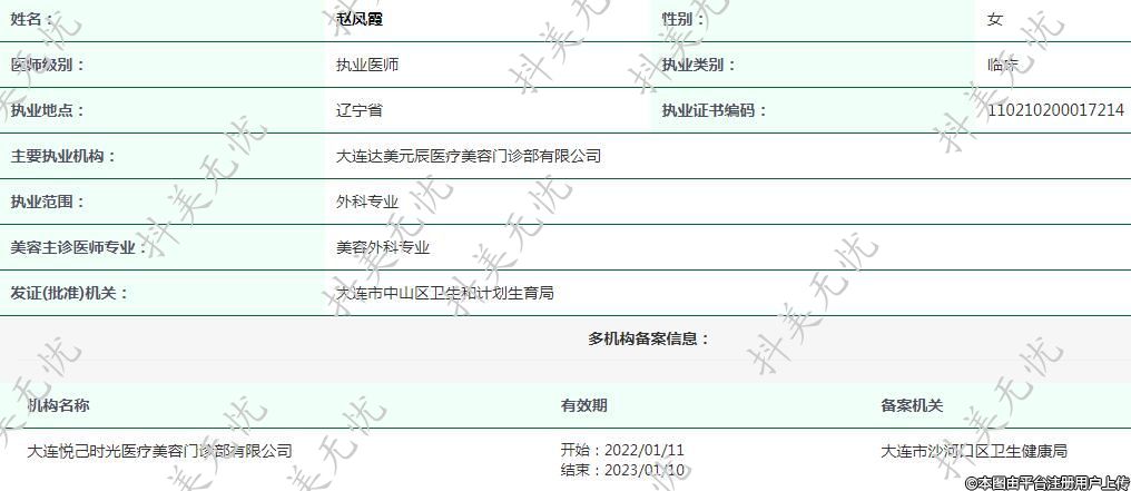 主要執(zhí)業(yè)機(jī)構(gòu):大連達(dá)美元辰醫(yī)療美容門(mén)診部有限公司