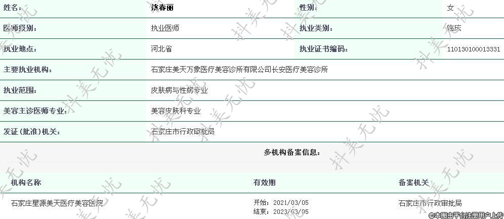 主要執(zhí)業(yè)機(jī)構(gòu):石家莊美天萬象醫(yī)療美容診所有限公司長安醫(yī)療美容診所