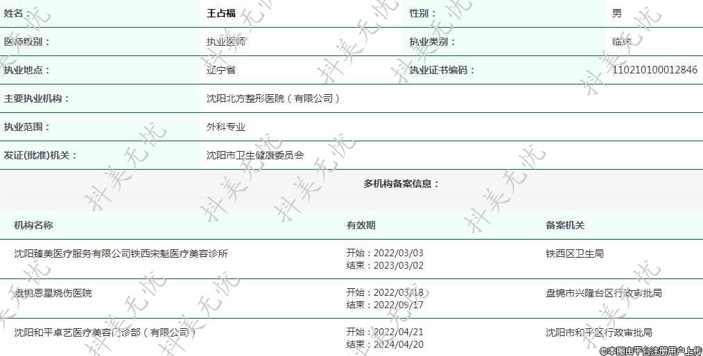 主要執(zhí)業(yè)機(jī)構(gòu):沈陽北方整形醫(yī)院(有限公司)