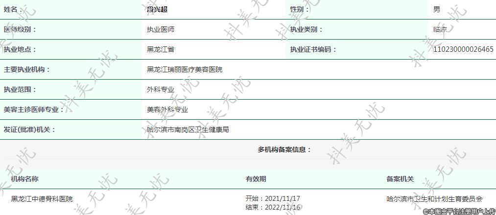 現(xiàn)任黑龍江瑞麗醫(yī)療美容執(zhí)業(yè)醫(yī)師