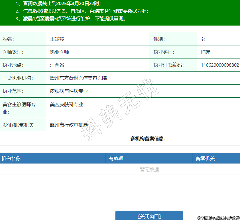 姓名:王媛媛性別:女醫(yī)師級別:執(zhí)業(yè)醫(yī)師執(zhí)業(yè)類別:臨床執(zhí)業(yè)地點:江西省執(zhí)業(yè)證書編碼:110620000008802主要執(zhí)業(yè)機(jī)構(gòu):贛州東方薇琳醫(yī)療美容醫(yī)院執(zhí)業(yè)范圍:皮膚病與性病專業(yè)美容主診醫(yī)師專業(yè):美容皮膚科專業(yè)發(fā)證(批準(zhǔn))機(jī)關(guān):贛州市行政審批局