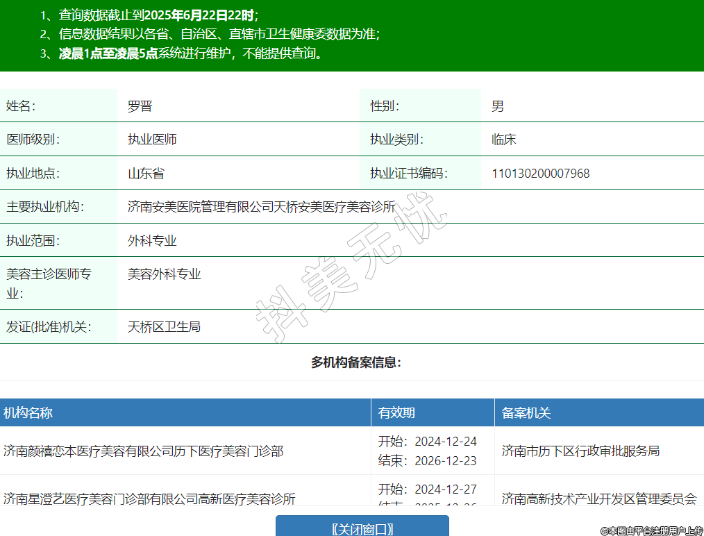 機構名稱 有效期 備案機關 濟南顏禧戀本醫(yī)療美容有限公司歷下醫(yī)療美容門診部 開始:2024-12-24結束:2026-12-23濟南市歷下區(qū)行政審批服務局 濟南星澄藝醫(yī)療美容門診部有限公司高新醫(yī)療美容診所 開始:2024-12-27結束:2025-12-26濟南高新技術產(chǎn)業(yè)開發(fā)區(qū)管理委員會 淄博妝典醫(yī)療有限公司張店亞韓醫(yī)療美容門診部 開始:2025-02-13結束:2026-02-12淄博市張店區(qū)衛(wèi)生健康局 濟南麗合醫(yī)療美容醫(yī)院 開始:2025-03-20結束:2026-03-19濟南市衛(wèi)生健康委員會 濟南俏嘉麗醫(yī)療美容醫(yī)院有限公司槐蔭俏嘉麗醫(yī)療美容門診部 開始:2025-05-25結束:2027-05-24濟南市槐蔭區(qū)行政審批服務局 濟南顏禧匯美美容咨詢有限公司歷下醫(yī)療美容診所 開始:2025-05-28結束:2026-05-27濟南市歷下區(qū)行政審批服務局 旭美風尚(濟南)醫(yī)療美容有限公司歷下醫(yī)療美容門診部 開始:2025-05-29結束:2026-05-28濟南市歷下區(qū)衛(wèi)生健康局 -