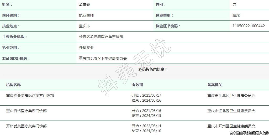長(zhǎng)壽區(qū)孟信春醫(yī)療美容執(zhí)業(yè)醫(yī)師