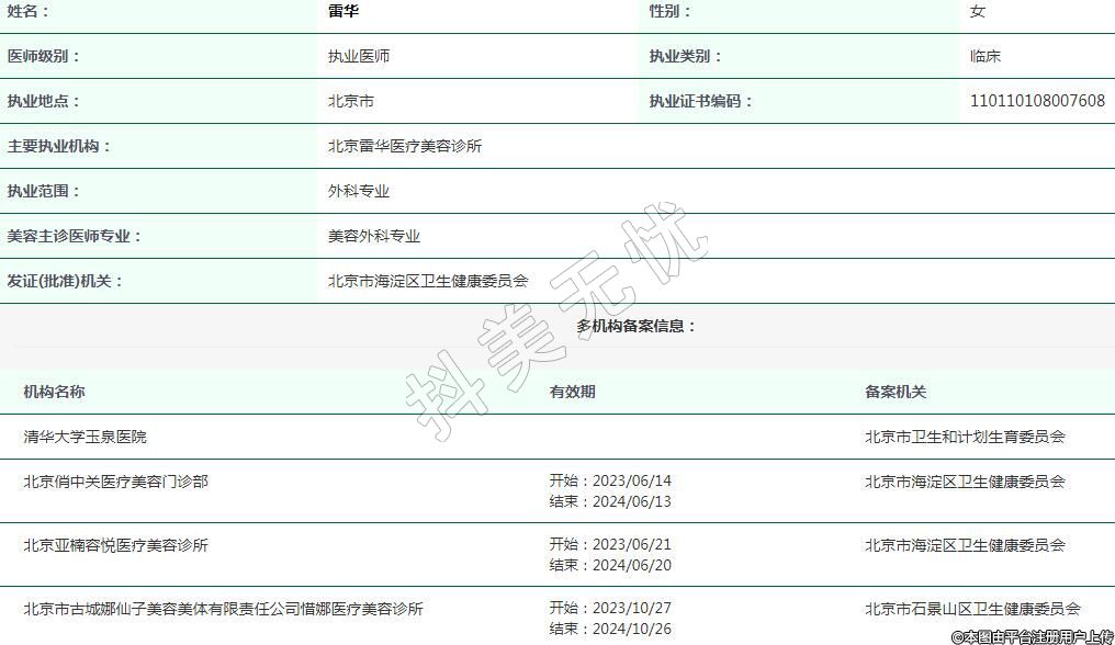 主要執(zhí)業(yè)機(jī)構(gòu):北京雷華醫(yī)療美容診所