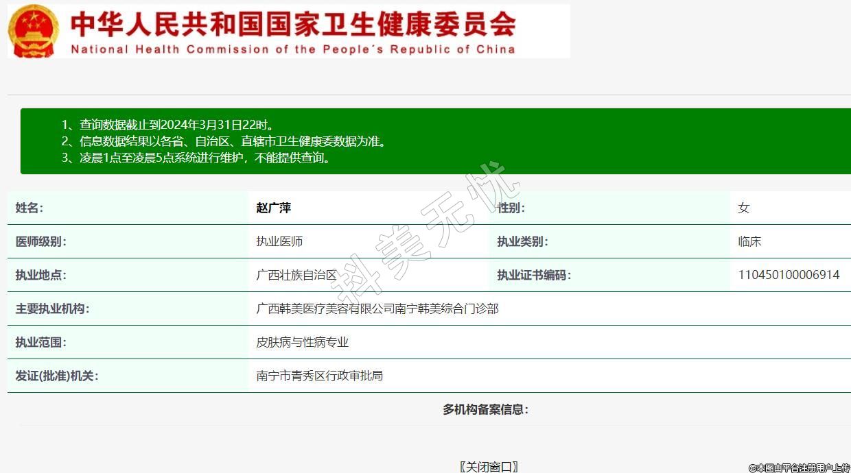 主要執(zhí)業(yè)機構(gòu):廣西韓美醫(yī)療美容有限公司南寧韓美綜合門診部