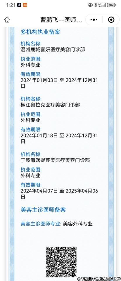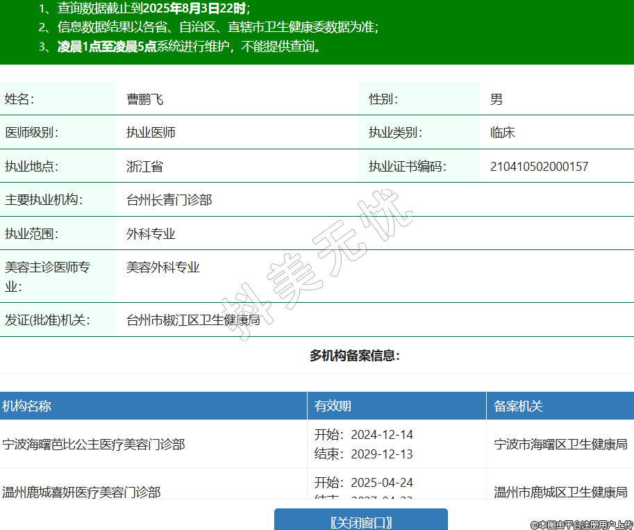 機構名稱 有效期 備案機關 寧波海曙芭比公主醫(yī)療美容門診部 開始:2024-12-14結束:2029-12-13寧波市海曙區(qū)衛(wèi)生健康局 溫州鹿城喜妍醫(yī)療美容門診部 開始:2025-04-24結束:2027-04-23溫州市鹿城區(qū)衛(wèi)生健康局 溫州甌海星耀美辰整形外科門診部 開始:2025-05-10結束:2027-05-08溫州市甌海區(qū)衛(wèi)生健康局 椒江華錦醫(yī)療美容門診部 開始:2025-07-09結束:2027-07-08臺州市椒江區(qū)衛(wèi)生健康局 溫州鹿城芭媞芭媞醫(yī)療美容診所 開始:2025-07-31結束:2026-07-30溫州市鹿城區(qū)衛(wèi)生健康局 -