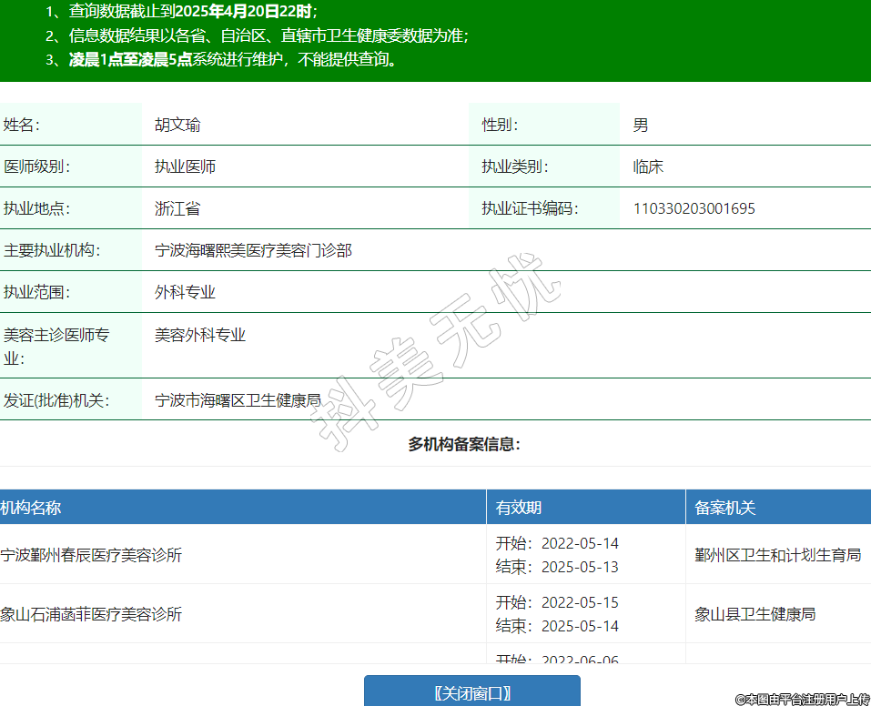 機構名稱 有效期 備案機關 寧波鄞州春辰醫(yī)療美容診所 開始:2022-05-14結束:2025-05-13鄞州區(qū)衛(wèi)生和計劃生育局 象山石浦菡菲醫(yī)療美容診所 開始:2022-05-15結束:2025-05-14象山縣衛(wèi)生健康局 衢州市柯城區(qū)桂美人醫(yī)療美容門診部(普通合伙) 開始:2022-06-06結束:2027-06-05衢州市柯城區(qū)衛(wèi)生健康局 寧波江北尚麗醫(yī)療美容門診部 開始:2023-08-31結束:2026-08-31寧波市江北區(qū)衛(wèi)生健康局 桐廬韓加醫(yī)療美容門診部 開始:2024-03-06結束:2027-03-04桐廬縣衛(wèi)生健康局 寧波江北外灘纖姿醫(yī)療美容門診部 開始:2024-05-21結束:2027-06-20寧波市江北區(qū)衛(wèi)生健康局 嘉興畫美醫(yī)療美容診所 開始:2024-12-02結束:2027-12-01嘉興市南湖區(qū)衛(wèi)生健康局 寧波海曙初美星范醫(yī)療美容門診部 開始:2025-04-09結束:2028-04-08寧波市海曙區(qū)衛(wèi)生健康局 -