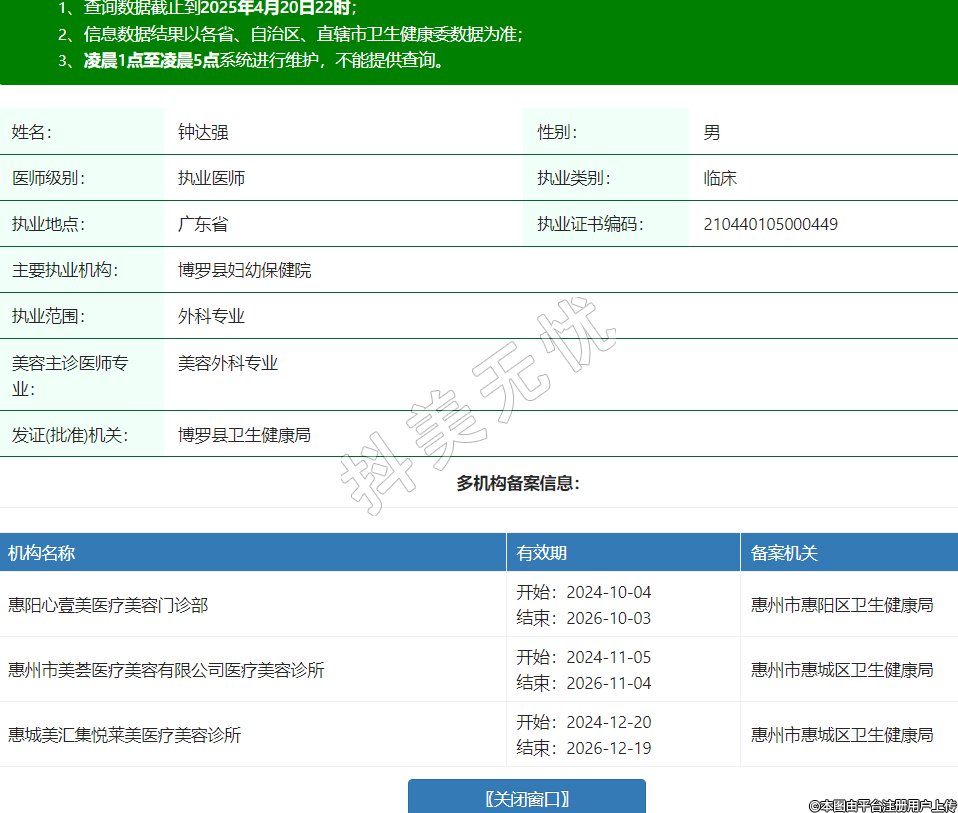 機(jī)構(gòu)名稱 有效期 備案機(jī)關(guān) 惠陽心壹美醫(yī)療美容門診部 開始:2024-10-04結(jié)束:2026-10-03惠州市惠陽區(qū)衛(wèi)生健康局 惠州市美薈醫(yī)療美容有限公司醫(yī)療美容診所 開始:2024-11-05結(jié)束:2026-11-04惠州市惠城區(qū)衛(wèi)生健康局 惠城美匯集悅?cè)R美醫(yī)療美容診所 開始:2024-12-20結(jié)束:2026-12-19惠州市惠城區(qū)衛(wèi)生健康局 -