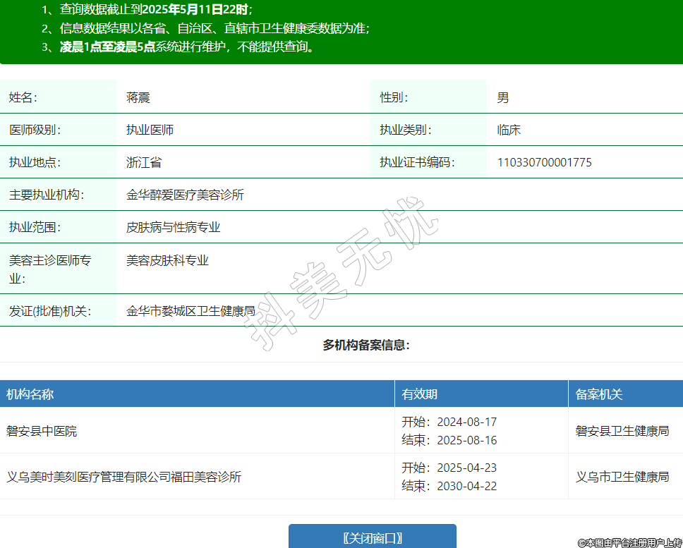 機(jī)構(gòu)名稱 有效期 備案機(jī)關(guān) 磐安縣中醫(yī)院 開(kāi)始:2024-08-17結(jié)束:2025-08-16磐安縣衛(wèi)生健康局 義烏美時(shí)美刻醫(yī)療管理有限公司福田美容診所 開(kāi)始:2025-04-23結(jié)束:2030-04-22義烏市衛(wèi)生健康局 -