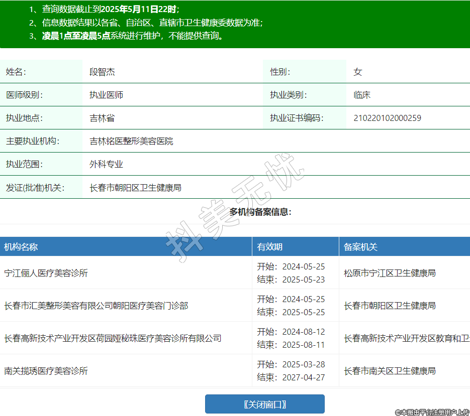 機構名稱 有效期 備案機關 寧江儷人醫(yī)療美容診所 開始:2024-05-25結束:2025-05-23松原市寧江區(qū)衛(wèi)生健康局 長春市匯美整形美容有限公司朝陽醫(yī)療美容門診部 開始:2024-05-25結束:2025-05-25長春市朝陽區(qū)衛(wèi)生健康局 長春高新技術產業(yè)開發(fā)區(qū)荷園婭秘珠醫(yī)療美容診所有限公司 開始:2024-08-12結束:2025-08-11長春高新技術產業(yè)開發(fā)區(qū)教育和衛(wèi)生健康局 南關攬琇醫(yī)療美容診所 開始:2025-03-28結束:2027-04-27長春市南關區(qū)衛(wèi)生健康局 -