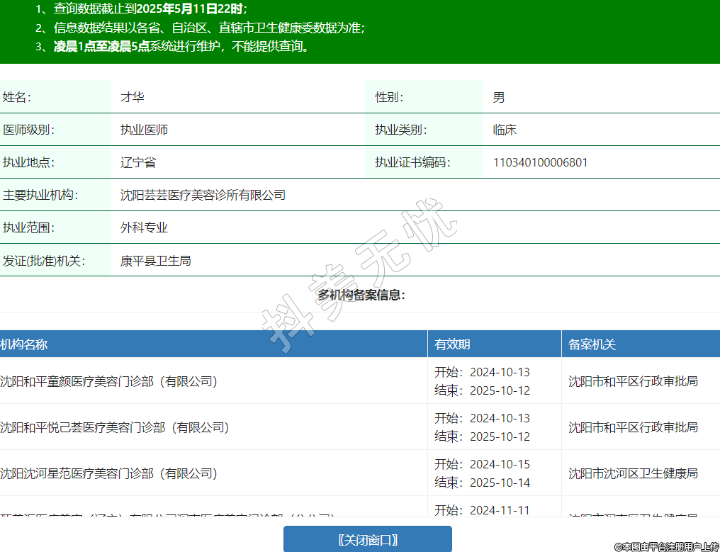 機(jī)構(gòu)名稱 有效期 備案機(jī)關(guān) 沈陽和平童顏醫(yī)療美容門診部(有限公司) 開始:2024-10-13結(jié)束:2025-10-12沈陽市和平區(qū)行政審批局 沈陽和平悅己薈醫(yī)療美容門診部(有限公司) 開始:2024-10-13結(jié)束:2025-10-12沈陽市和平區(qū)行政審批局 沈陽沈河星范醫(yī)療美容門診部(有限公司) 開始:2024-10-15結(jié)束:2025-10-14沈陽市沈河區(qū)衛(wèi)生健康局 甄美匯醫(yī)療美容(遼寧)有限公司渾南醫(yī)療美容門診部(分公司) 開始:2024-11-11結(jié)束:2025-12-10沈陽市渾南區(qū)衛(wèi)生健康局 沈陽蘭積醫(yī)療管理有限公司渾南三路醫(yī)療美容診所 開始:2024-11-22結(jié)束:2025-12-21沈陽市渾南區(qū)衛(wèi)生健康局 沈陽嘉顏里醫(yī)療美容有限公司鐵西衛(wèi)工北街醫(yī)療美容診所 開始:2024-12-26結(jié)束:2025-12-25鐵西區(qū)衛(wèi)生局 沈陽和平華顏醫(yī)療美容門診部(有限公司) 開始:2025-02-04結(jié)束:2026-03-03沈陽市和平區(qū)行政審批局 沈陽美置顏雙美醫(yī)療美容門診部(有限公司) 開始:2025-04-02結(jié)束:2026-04-01沈陽市沈河區(qū)衛(wèi)生健康局 -