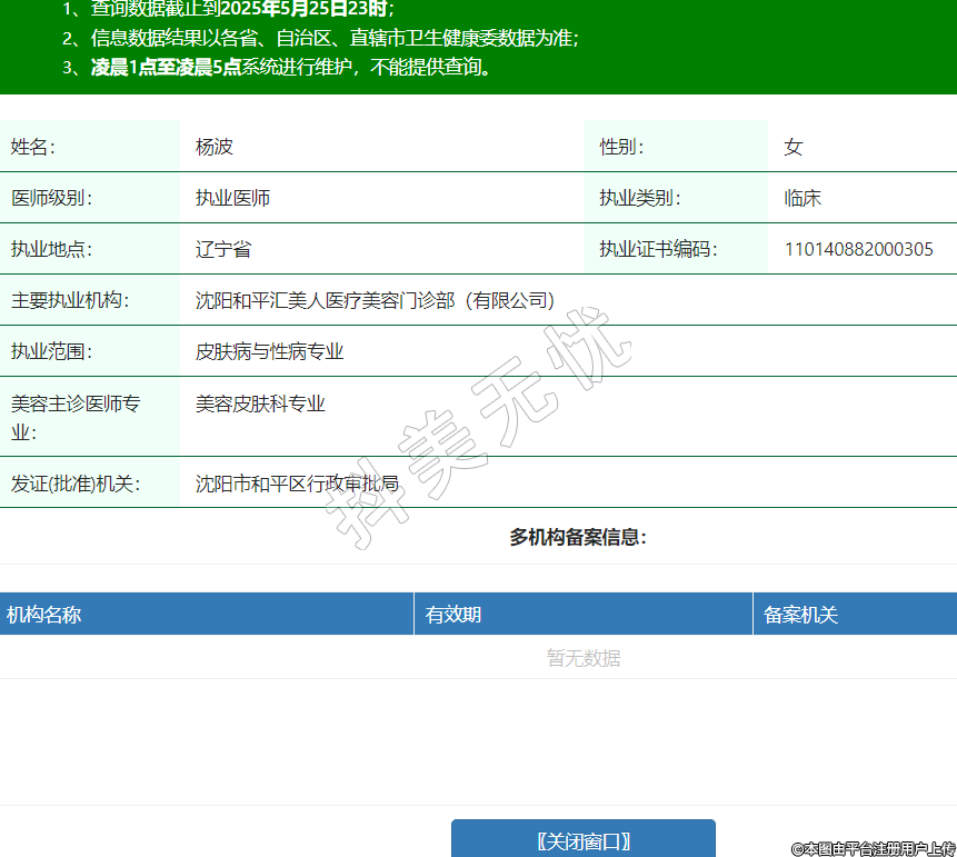 姓名:楊波性別:女醫(yī)師級(jí)別:執(zhí)業(yè)醫(yī)師執(zhí)業(yè)類別:臨床執(zhí)業(yè)地點(diǎn):遼寧省執(zhí)業(yè)證書(shū)編碼:110140882000305主要執(zhí)業(yè)機(jī)構(gòu):沈陽(yáng)和平匯美人醫(yī)療美容門(mén)診部(有限公司)執(zhí)業(yè)范圍:皮膚病與性病專業(yè)美容主診醫(yī)師專業(yè):美容皮膚科專業(yè)發(fā)證(批準(zhǔn))機(jī)關(guān):沈陽(yáng)市和平區(qū)行政審批局