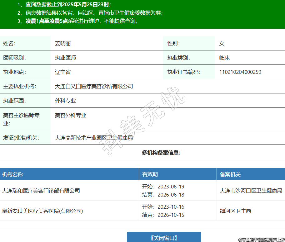 機(jī)構(gòu)名稱 有效期 備案機(jī)關(guān) 大連瑞和醫(yī)療美容門診部有限公司 開始:2023-06-19結(jié)束:2026-06-18大連市沙河口區(qū)衛(wèi)生健康局 阜新安琪美醫(yī)療美容醫(yī)院(有限公司) 開始:2023-10-16結(jié)束:2026-10-15細(xì)河區(qū)衛(wèi)生局 -